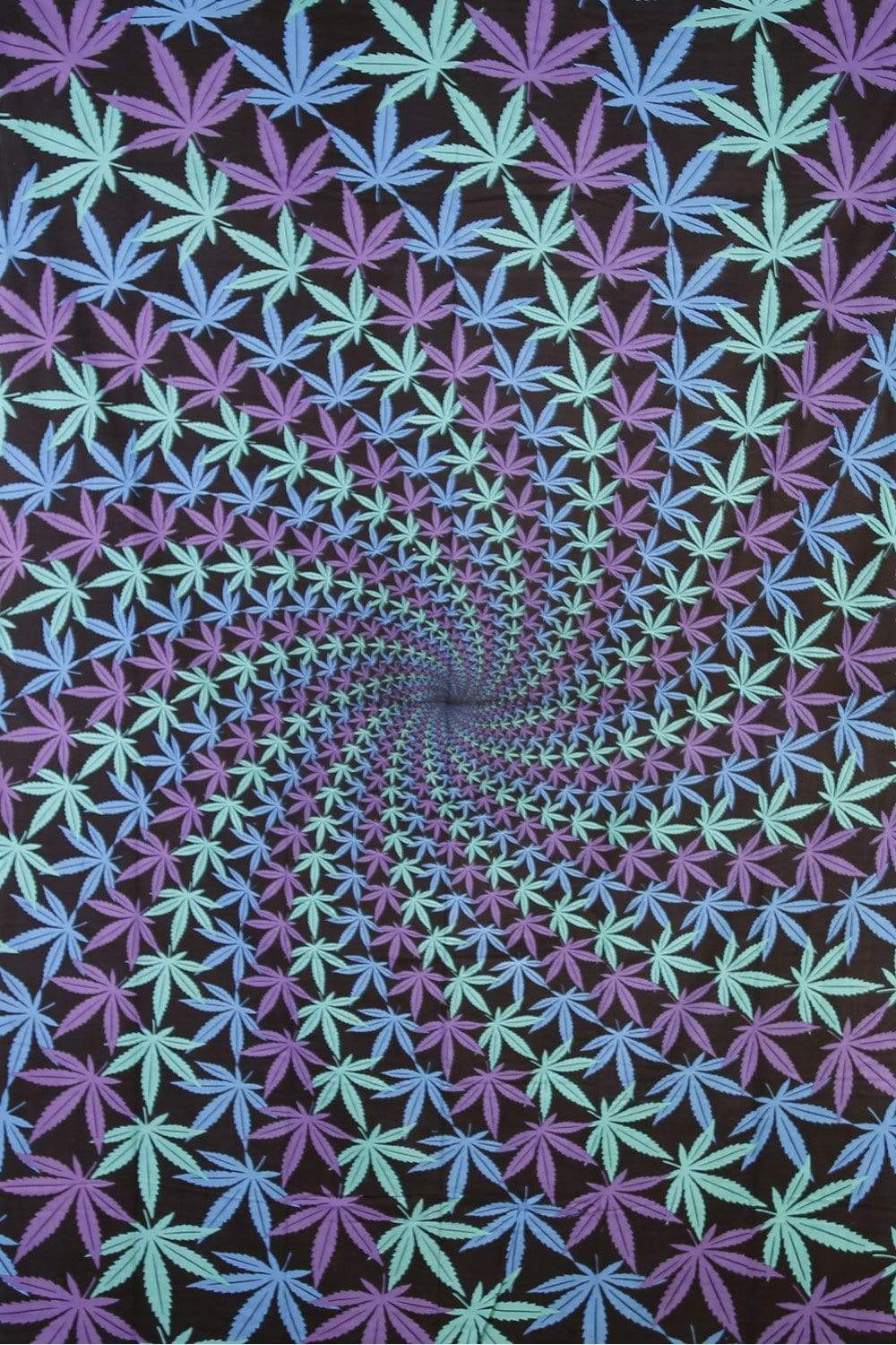 60 x 90" tapestry. Illuminate your walls with the 3D Night Leaf Spiral Tapestry. Hang, spread or toss it wherever you like. A vibrant 420 tapestry for your wall, bed or a free spirit afternoon hanging under the sun. Style your trippy room decor your way. Trippy, hippie, psychedelic tapestries you can vibe.
