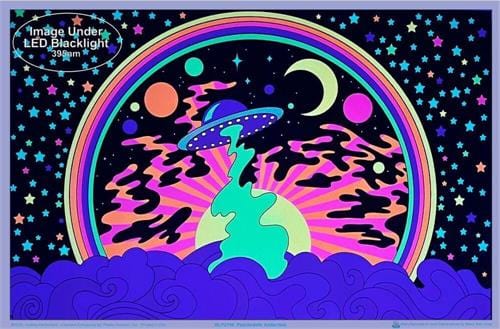 35 x 23" flocked velvet black light poster. Printed using fluorescent inks, the Psychedelic Abduction Black Light Poster is a kick back to old school fuzzy black light reactive posters. Turn your lights down low; under a UV black light it glows with a special effect. Trippy, hippie, psychedelic black light posters you can vibe.