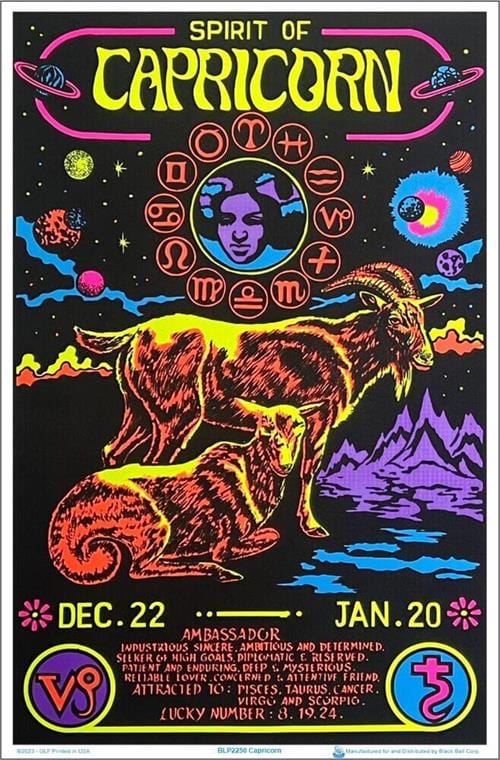 23 x 35" flocked velvet black light poster. Printed using fluorescent inks, the Capricorn Zodiac Sign Black Light Poster is a kick back to old school fuzzy black light reactive posters. December 22 thru January 20, all your hard work will pay off Capricorn.