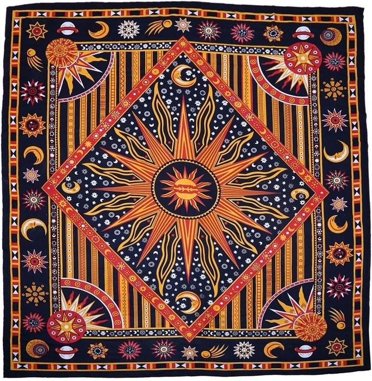84 x 94" tapestry. Spread across the bed or hanging from the wall, be inspired by the celestial sun and moon trippy, hippie, psychedelic wall tapestry. The vivid colors of a retro Indian design for home or dorm decor. Woven from 100% cotton.