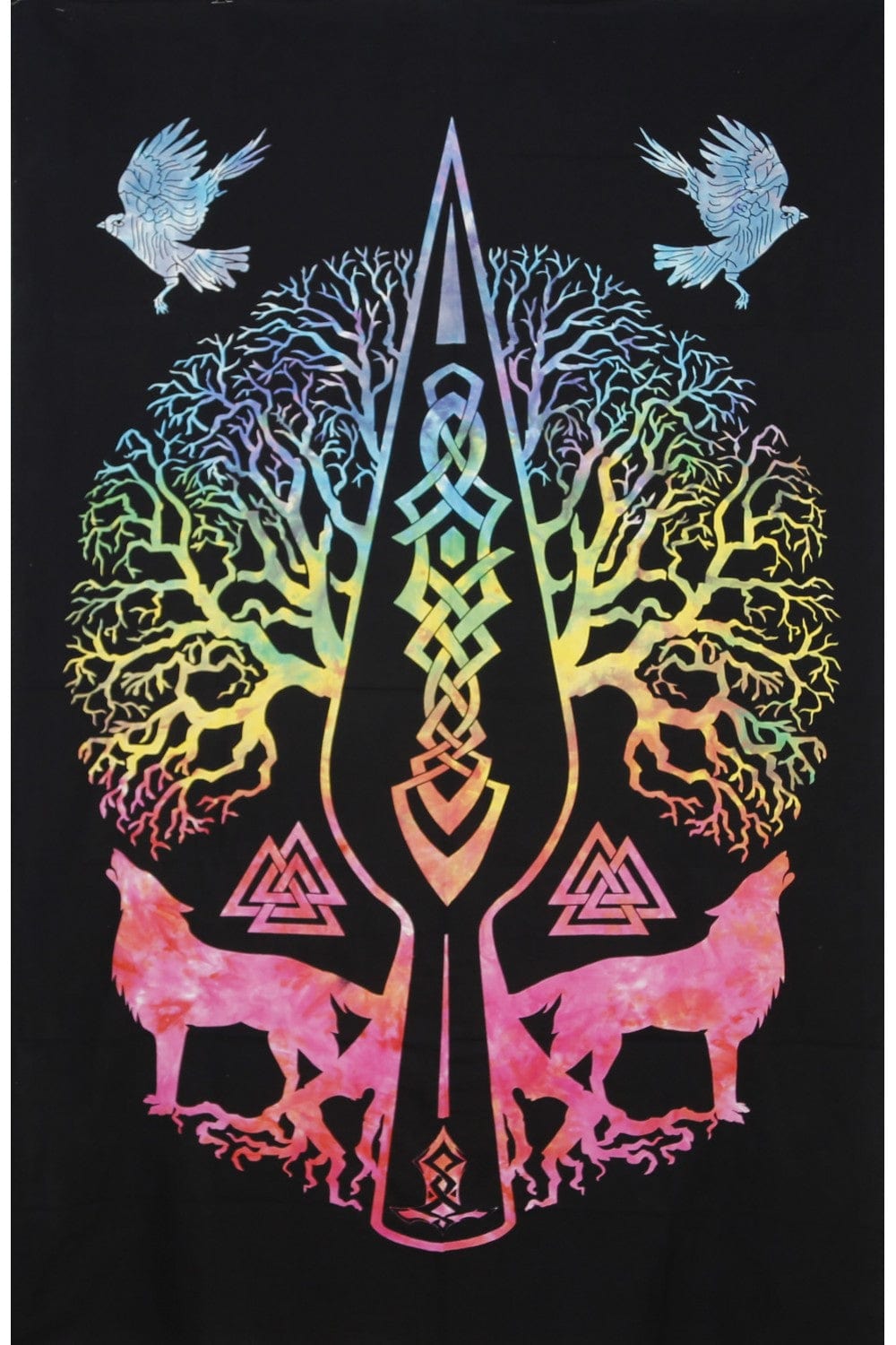 52 x 80" tapestry. Illuminate your walls with the Celtic Wolf Tree Tie-Dye Tapestry. Hang, spread or toss it wherever you like. A vibrant celtic tapestry for your wall, bed or a free spirit afternoon hanging under the sun. Style your trippy room decor your way. Trippy, hippie, psychedelic tapestries you can vibe.