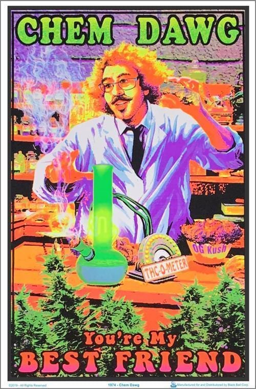 23 x 35" black light velvet poster. Get a little pick me up with your best friend chem dawg fuzzy black light poster. A 420 trippy black light poster to keep your senses tingling.