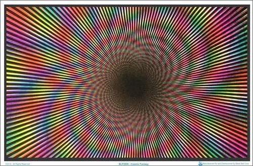 Printed using fluorescent inks on a thicker matte paper, it's a reproduction of a popular vintage fuzzy black light reactive poster. Turn your lights down low; under a UV black light it glows with a special effect. Trippy, hippie, psychedelic black light posters you can vibe.