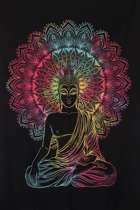 84 x 94" tapestry. Illuminate your walls with the Dreaming Buddha Tie-Dye tapestry. Hang, spread or toss it wherever you like. A vibrant spiritual tapestry for your wall, bed or a free spirit afternoon hanging under the sun. Style your trippy room decor your way. Trippy, hippie, psychedelic tapestries you can vibe.