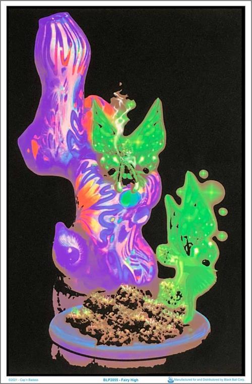 23 x 35" flocked velvet black light poster. With fluorescent inks contrasted by fuzzy black velvet, the vibrant colors of this dazed little fairy are sure to put you in a mellow mood. She pops under the UV black light!