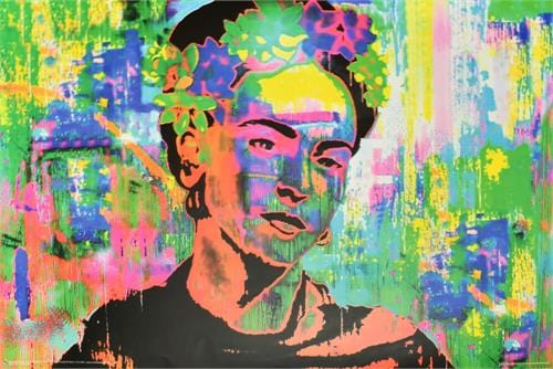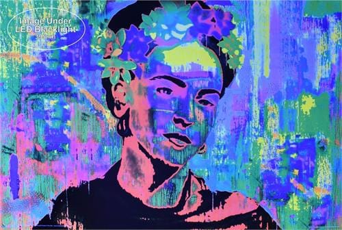36 x 24" black light poster. Printed with fluorescent inks on standard paper, the Frida Kahlo Black Light Poster pops with vivid colors. Turn your lights down low; under a UV black light it glows with a special effect. Trippy, hippie, psychedelic black light reactive posters you can vibe.