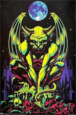 24 x 36" black light poster. Printed with fluorescent inks on standard paper, the Gargoyle Watch Black Light Poster pops with vivid colors. Turn your lights down low; under a UV black light it glows with a special effect. Trippy, psychedelic, retro black light reactive posters you can vibe.