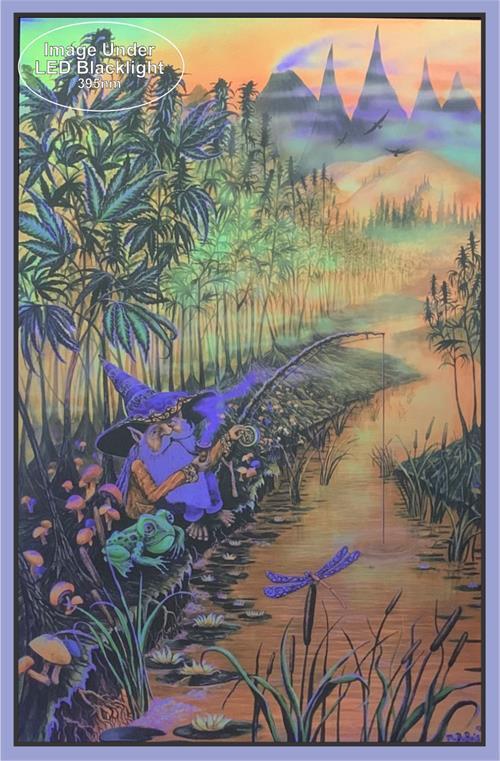 24 x 36" black light poster. Printed with fluorescent inks on standard paper, the Mike Dubois Gnome Fishing Black Light Poster pops with vivid colors. Turn your lights down low; under a UV black light it glows with a special effect. Trippy, psychedelic, retro black light reactive posters you can vibe.