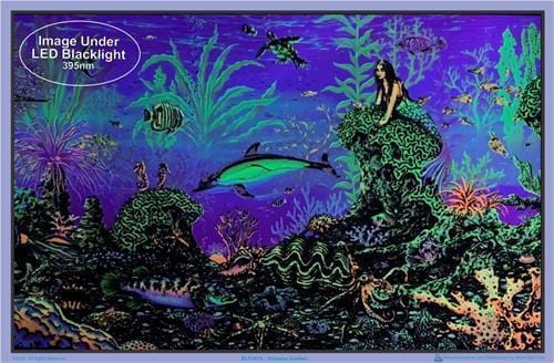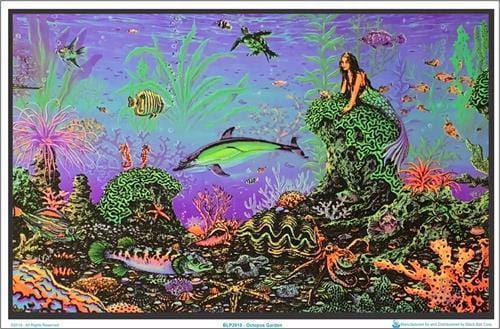 35 x 23" flocked velvet black light poster. Printed using fluorescent inks, the Mermaid Octopus Garden Black Light Poster is a kick back to old school fuzzy black light reactive posters. Turn your lights down low; under a UV black light it glows with a special effect. Trippy, hippie, psychedelic black light posters you can vibe.