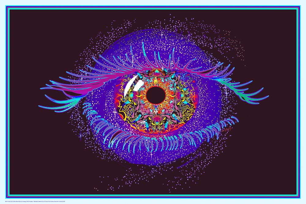 36 x 24" black light poster. Printed with fluorescent inks on standard paper, the Mike DuBois Cosmic Eye Black Light Poster pops with vivid colors. Turn your lights down low; under a UV black light it glows with a special effect. Trippy, hippie, psychedelic black light reactive posters you can vibe.