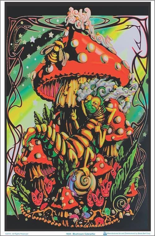 23 x 35" blacklight poster. Like the caterpillar feeds his mind in Alice in Wonderland, feed your senses with a vibrant black light poster.