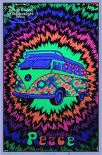 23 x 35" flocked velvet black light poster. The VW peace van poster has vibrant fluorescent inks contrasted by fuzzy black velvet. Get on board the bus and give peace a chance. Trippy, hippie, psychedelic black light posters you can vibe.