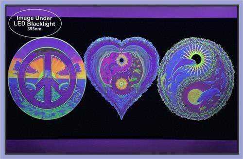 Printed using fluorescent inks on standard poster paper, it's a reproduction of a popular vintage black light reactive poster. Turn your lights down low; under a UV black light it glows with a special effect. Trippy, hippie, psychedelic black light posters you can vibe.