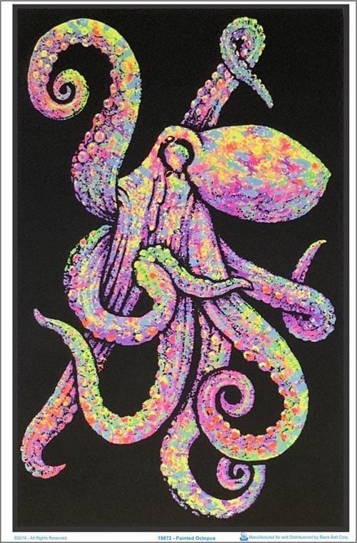 23 x 35" black light velvet poster. Nestle into the fluorescent inky depths of the octopus garden with this fuzzy black light poster. A psychedelic rainbow trip to keep you at one with your animal friends.