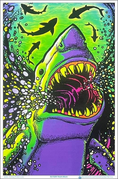 23 x 35" flocked velvet black light poster. Printed using fluorescent inks and contrasted with fuzzy black velvet, the Shark Attack Black Light Poster is a kick back to old school black light reactive posters. Turn your lights down low; under a UV black light it glows with a special effect. Trippy, hippie, psychedelic black light posters you can vibe.