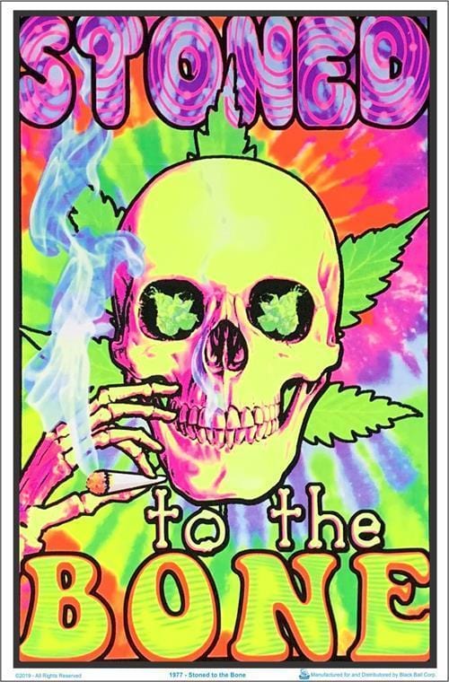 23 x 35" black light poster. Stoned to the bone. Black light reactive fluorescent ink against fuzzy black velvet.