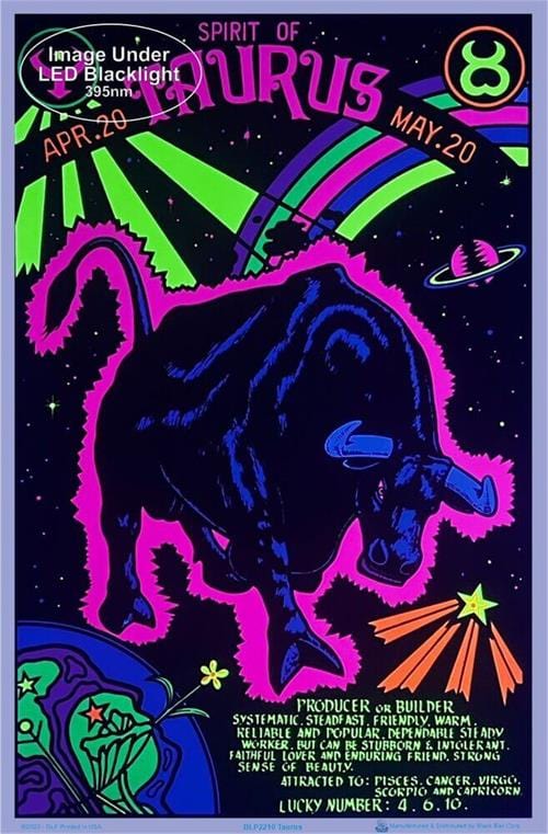 23 x 35" flocked velvet black light poster. Printed using fluorescent inks, the Taurus Zodiac Sign Black Light Poster is a kick back to old school fuzzy black light reactive posters. April 20 thru May 20, staying grounded in the universe Taurus.