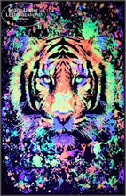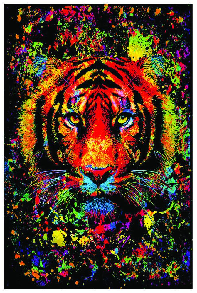 24 x 36" black light poster. This wild psychedelic tiger wall art glows bright florescent colors under a UV light. Glow with a black light reactive trippy, hippie, psychedelic poster.