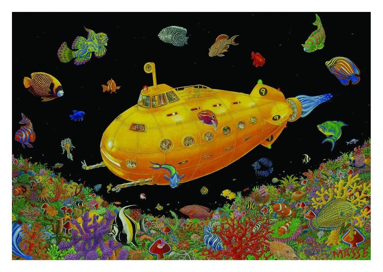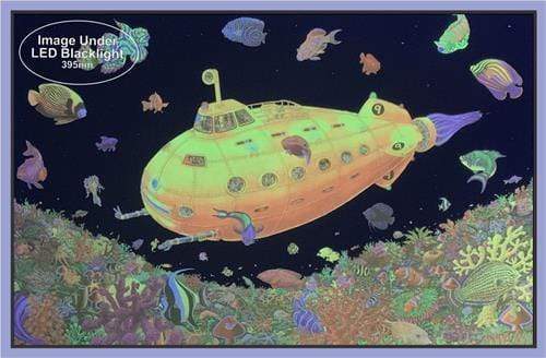 32 x 22" poster. Illuminate your walls with the Tom Masse Yellow Submarine Black Light Poster Trippy, hippie, psychedelic wall art that stands out in any room decor. Printed on standard poster paper, it’s a Beatles poster you can vibe.