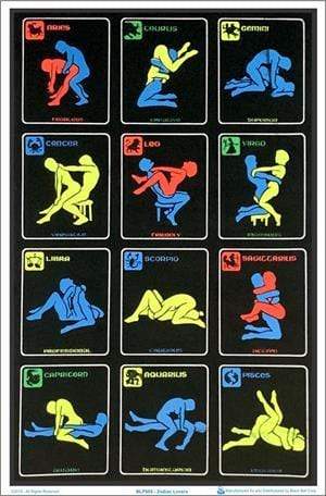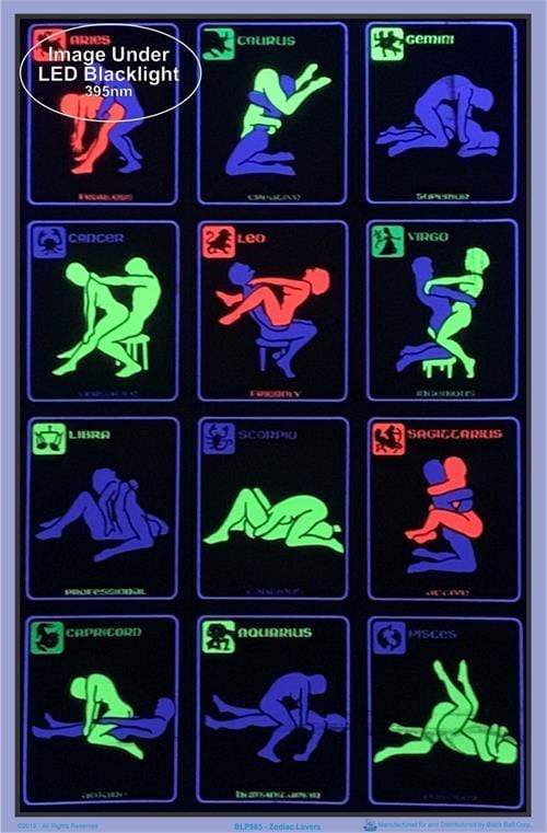 23 x 35" flocked velvet black light poster. Printed using fluorescent inks, the Zodiac Position Black Light Poster is a kick back to old school fuzzy black light reactive posters. Turn your lights down low; under a UV black light it glows with a special effect. Trippy, hippie, psychedelic black light posters you can vibe.