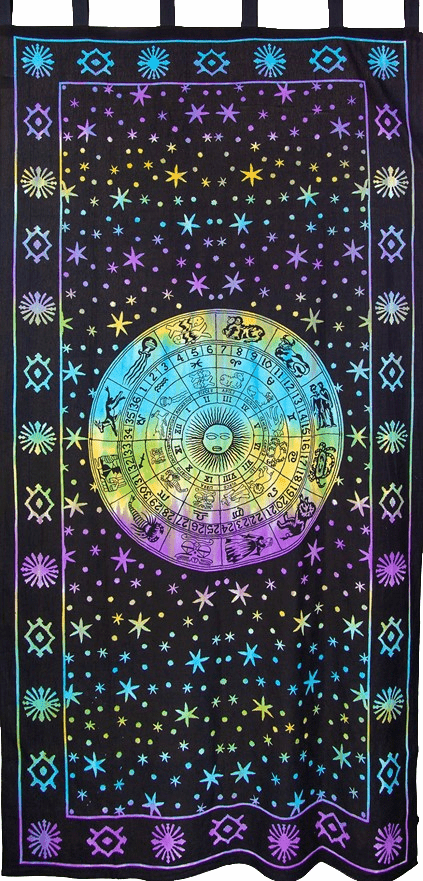 44 x 88" curtain. A single tie-dye zodiac curtain panel with tabs for hanging. Illuminate your place with the perfect light. A window drape designed for the bedroom, dorm or living room home decor. Trippy, hippie, psychedelic curtains you can vibe.